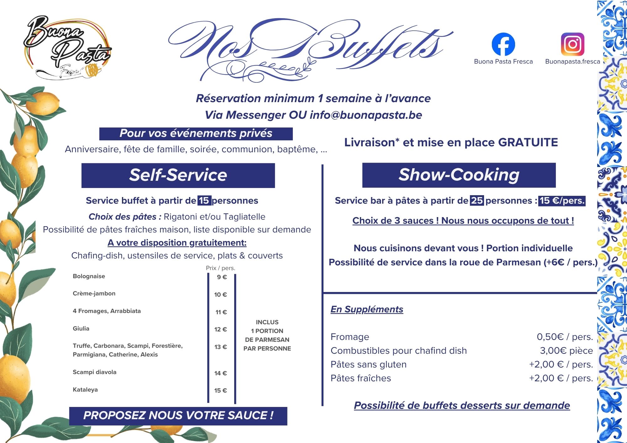 Né en octobre 2024, notre concept de bar à pâtes mobile et service traiteur spécialisé dans les recettes italiennes authentiques est le fruit d’un amour sincère pour la cuisine familiale, celui que l’on cultive depuis le plus jeune âge, dans les cuisines de nos nonne.
